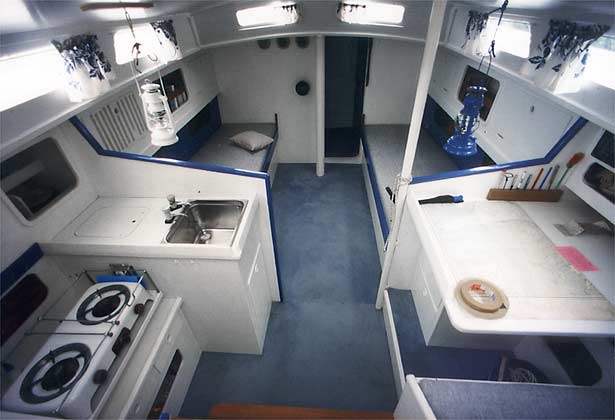 "Hallo, habe Wind 7 gegenan, vorhin sogar mit Anemometer Windstärke 8 gemessen. Ich wundere mich, daß ich überhaupt eine Telefonverbindung hinkriege. Meine Position: 27° Süd 41° West, 5985 Seemeilen von zu Hause entfernt. Habe einen Durchschnitt von 112 Seemeilen ersegelt. Diese Fahrt ist sowieso mit früher nicht zu vergleichen es steht diesmal das Vorankommen im Vordergrund. Klar mit 60 ist man schon langsamer an Deck. Ein Reff ins Groß binden dauerte früher 2 1/2 Minuten, heute 3 1/2. Hauptsache ist doch, ich behalte die Übersicht. Das Boot steht im Vordergrund. Alle bisher aufgetretenen Defekte sind zu beheben, nur der Unterwasserbewuchs ist trotz neuem Anstrich nur Tage vor der Abfahrt sehr stark. Mein Supersegel, der 15 m2 Klüver, ist über Bord gefallen, habe ihn aber wieder auffischen können. Dann muß ich das Fockfall erneuern, habe aber bei zwei Versuchen das letzte Stück in den Masttopp wegen der Dünung nicht geschafft. Vielleicht morgen. Meine Verfassung ist OK seemännisch und segeltechnisch alles im Griff. Ich hatte mir nur vorgestellt, mit 60 Jahren ein wenig gleichmütiger zu sein, aber nein es ist ein stetes Auf und Ab, auch innerlich. Endlich habe ich mir nach zwei Monaten einen kleinen Schwips angetrunken, aber prompt kam in der Nacht mehr Wind. Im Moment gehen wir mächtig zur Kehr, faxen geht nicht, ich will mich auch nicht ärgern. Stimmung ist nämlich gut, habe mich extra schick gemacht Kordhose, grünes Hemd. Grüße an alle." ![]() Die Kajüte der Kathena nui. Je nach Seegang und Windrichtung schläft Wilfried in der Backbord- oder Steuerbordkoje. Aus der Hundekoje kann er nachts den Sternenhimmel sehen, und wenn die Kajüte unter Wasser steht, ist Auswahl nicht schlecht. Dazu ein großer Kartentisch für die Navigation und das Log-Tagebuch. |