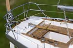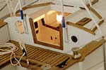 Auf meiner Homepage, Datum 24. Mai 2004, habe ich ja schon eine Zwischenbilanz gezogen, und jetzt kann ich nur noch ergänzen: Rumpf und Deck sind aus Holz, ebenso der Mast (sechsfach verleimt). Luken beweglich mit Schraubverschlüssen, die Aries ist funktionsfähig. Ich wiederhole: alles im Maßstab 1:10. Unter Deck hat der Filigrantechniker selbst mein Kojen-Schlingerbrett nicht vergessen. Wer ganz genau in die Kajüte schaut wird Weltkarte, Barometer, Uhr, Hydrometer am Schott erkennen.