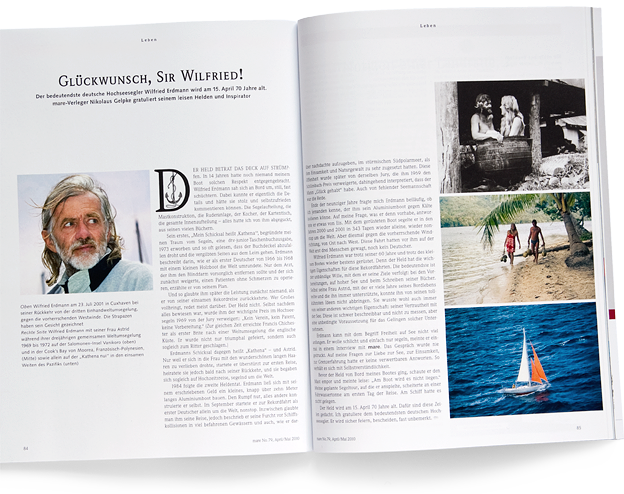 Einheimische verdorben? Ankerplätze offen? Mücken en masse? Behörden piesacken? Dann ist es Zeit, die Welt nonstop zu versuchen. Die magische Route, also nonstop und allein, ist sowieso das Allergrößte. Meine Nonstop-Reise jährt sich am 6. Juni zum 25. Mal. Und kein Deutscher ist mir bisher gefolgt. Schade. Die neue „Yacht“ (Nr. 9) hat das Thema aufgegriffen. Darin können Sie gerne eine Reihe Antworten lesen. Ich fand mich auf der Reise nicht nur seemännisch mutig, auch kühn mit der Kamera, wie außerdem nie zuvor und leider auch nicht danach. Für das Foto auf Seite 50 hänge ich im Gurt mit dem Po auf dem Wasser, Kamera in der Hand rund zwei Meter vom Boot entfernt. Und das bei 6 und 7 Knoten am Wind. Überhaupt habe ich Fotos von der magischen Route mitgebracht, wie kaum ein anderer Alleinsegler. Kaufen und ansehen. Das Buch. Neben der „Yacht“ hat auch „mare“ (Heft Nr. 79) mich überraschenderweise exzellent ins Bild gesetzt. Einige Sätze machen mich gar verlegen, aber als regelmäßiger Leser des Zweimonats-Magazins bin ich stolz, darin genannt zu werden. „mare“ ist die Zeitschrift der Meere. Sie berichtet über alles ums Meer, egal ob darüber oder darunter oder daneben, es muss nur ein Stück Nässe dabei sein. Kann ich sehr empfehlen. Schwimmen, Fischer, Schifffahrt, maritime Literatur, Wohnen am Meer und viele Themen mehr. Meine Lieblingshefte sind: Wege zum Meer; Auf großer Fahrt; Segeln (logisch); Blau. Wer lange Texte mag, der ist dort bestens aufgehoben. Der Anspruch hoch. Wir haben uns vor einer Woche ein neues Boot gekauft. Eine gebrauchte X 79. Wer den Bootstyp kennt oder davon gehört hat, wird wissen: sportlich, sportlich, sportlich. Keine Stehhöhe, kein Kocher, kein Klo, keine Maschine, kein Tisch. Kurzum: ein Sommerboot. Astrid war die Lokomotive für diesen Kauf. Sie wollte keine Moody oder Rassy mit Scheibe. Die Verrückte will noch einmal wild segeln. „Wilder als das wildeste Meer“. Wir wundern uns, wie viel Platz das neue Boot schon in unserem Denken einnimmt. Nur so zum Herumsegeln soll es nämlich nicht sein. Was genauer passiert, wird sich hier in der nächsten Meldung zeigen. |
