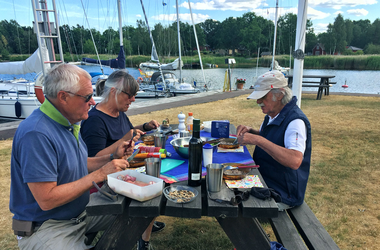 Hier bin ich wieder, am 43. Tag unserer Sommerfahrt. Mir Astrid inzwischen an der Ostküste Schwedens. Sehr lang das Schärengebiet bis Västervik, wo wir eine Pause gemacht haben. Fußball Deutschland gegen Schweden stand auf der Liste. Am liebsten im Getümmel einer Kneipe oder Bar, aber es passte nicht. Kein Platz. Eigentlich alle übervoll leider. Außer in einer Pizzeria mit schlechtem Bildschirm und unappetitlichen Pizzen. Was tun? Man kann sich die Stimmung in der Stadt vorstellen und wir nicht dabei, denn wir waren wirklich neugierig auf das wichtige Spiel. Wir verholten ins Clubhaus des Segelvereins SWWS, wo auch »Kathena nui« vertäut lag. An die 30 Mitglieder, zum Teil in schwedischen Trikots, fanden sich ein, plus wir vier Marion und Jürgen von »Mikosaari«. Der Fernseher wurde angeworfen, die schwedische Hymne im Stehen mitgesungen, sich abgeklatscht und los ging es. Als das 1:0 für Schweden fiel gab es kein Halten mehr doch das Siegtor zum 2:1 von Toni Kroos in der 96. Minute war der Stimmungskiller. Traurig und auf die Schnelle verließen die Schweden den Club.