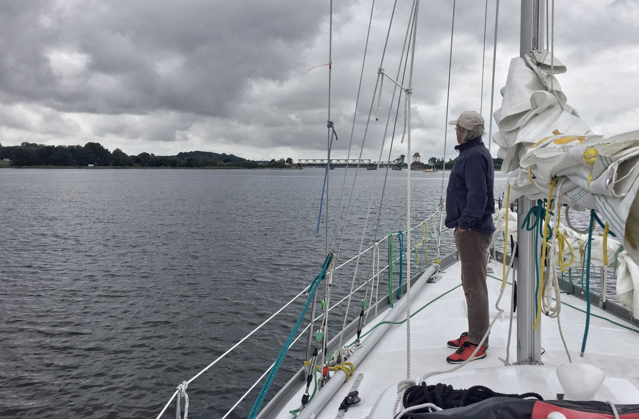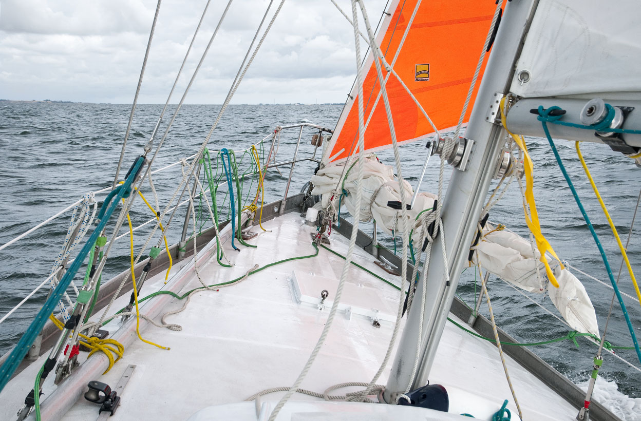 Dennoch ging es weiter. Nach Agersø mit erstmals gerefften Segeln. Ich konnte es kaum glauben. Ich wechselte die Fock I gegen die Fock II aus. Eine nasse Angelegenheit auf dem Vorschiff und alles dauerte doppelt so lange, nicht wie ich es von meiner Nonstopreise gewöhnt bin. Aber das Ergebnis war wundervoll, wie leicht und schnell wir durchs Meer flitzten. Einfach schön. Das zweite Mal reffen während der Sommertörns fand dann statt von Søby in die Schlei. Es ging diesmal schneller, und mit 6 und 7 Knoten war die Fahrt im Boot noch immer vielversprechend. Dort landeten wir zum »Luftholen« an einem Ankerplatz gegenüber von Maasholm ganz für uns allein. Wir blieben für die Nacht. Kein Wind, kein Motor, kein Niemand störte. Es war dann die letzte Nacht des Segelsommers 2018.
