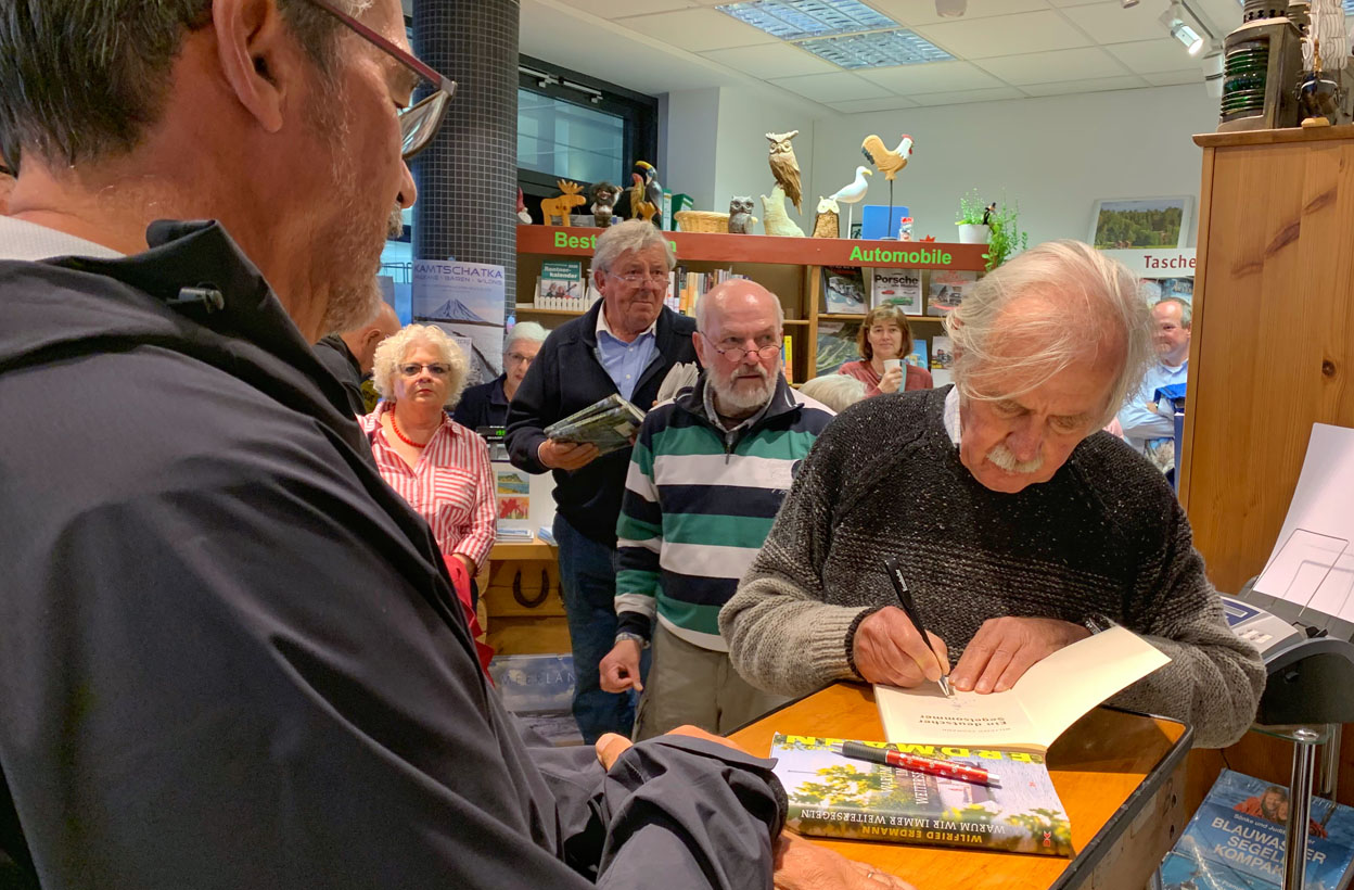 Ja, wahrhaftig. Es ist da. Das Buch über unsere Gotland-Fahrt und innerhalb der schwedischen Ostschären. Endlich. Am Freitag habe ich es in Schleswig in der kleinsten Buchhandlung der Stadt vorgestellt. Aufgeregt? Nein überhaupt nicht. Es war nur unheimlich heiß im Laden und das schon eine halbe Stunde zuvor. Als der Buchhändler startete war das Gedrängel groß. Glücklicherweise hatte er genug Bücher beim Verlag bestellt: über 100 Exemplare! Wie wohl keine andere Buchhandlung in Deutschland. Danke, Wolfgang Schröder. Zur Versorgung der Gäste mit Wasser, Bier und Salzbrezeln kam er durch die Enge nicht. Ich habe den Andrang zwiespältig erwartet, nachdem der Termin groß in der örtlichen Zeitung angekündigt war. Immerhin gingen 65 Exemplare von »Warum wir immer weitersegeln« über den Ladentisch. Vielen Dank an alle Kunden.