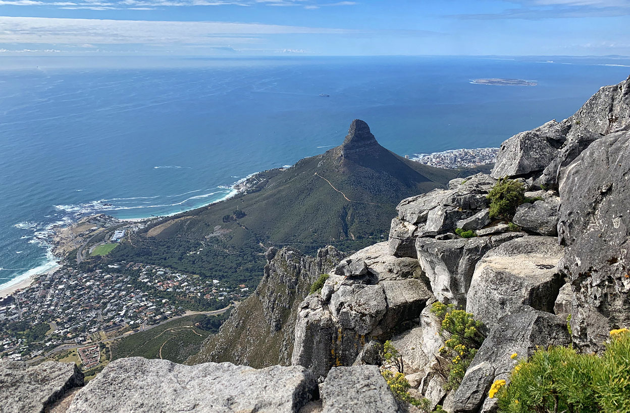 Markanter Lion’s Head und Gefängnisinsel Robben Island vom Tafelberg aus gesehen