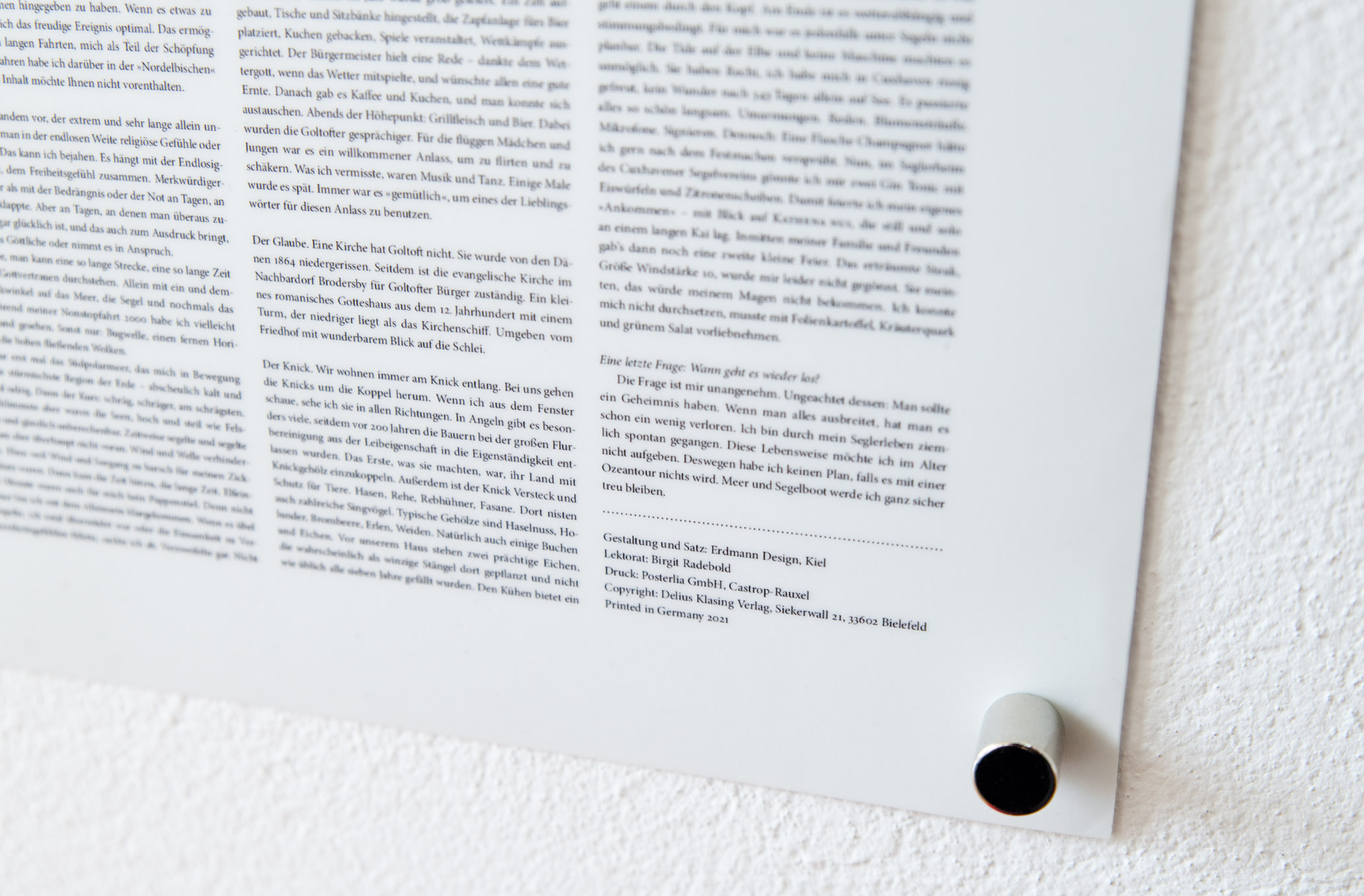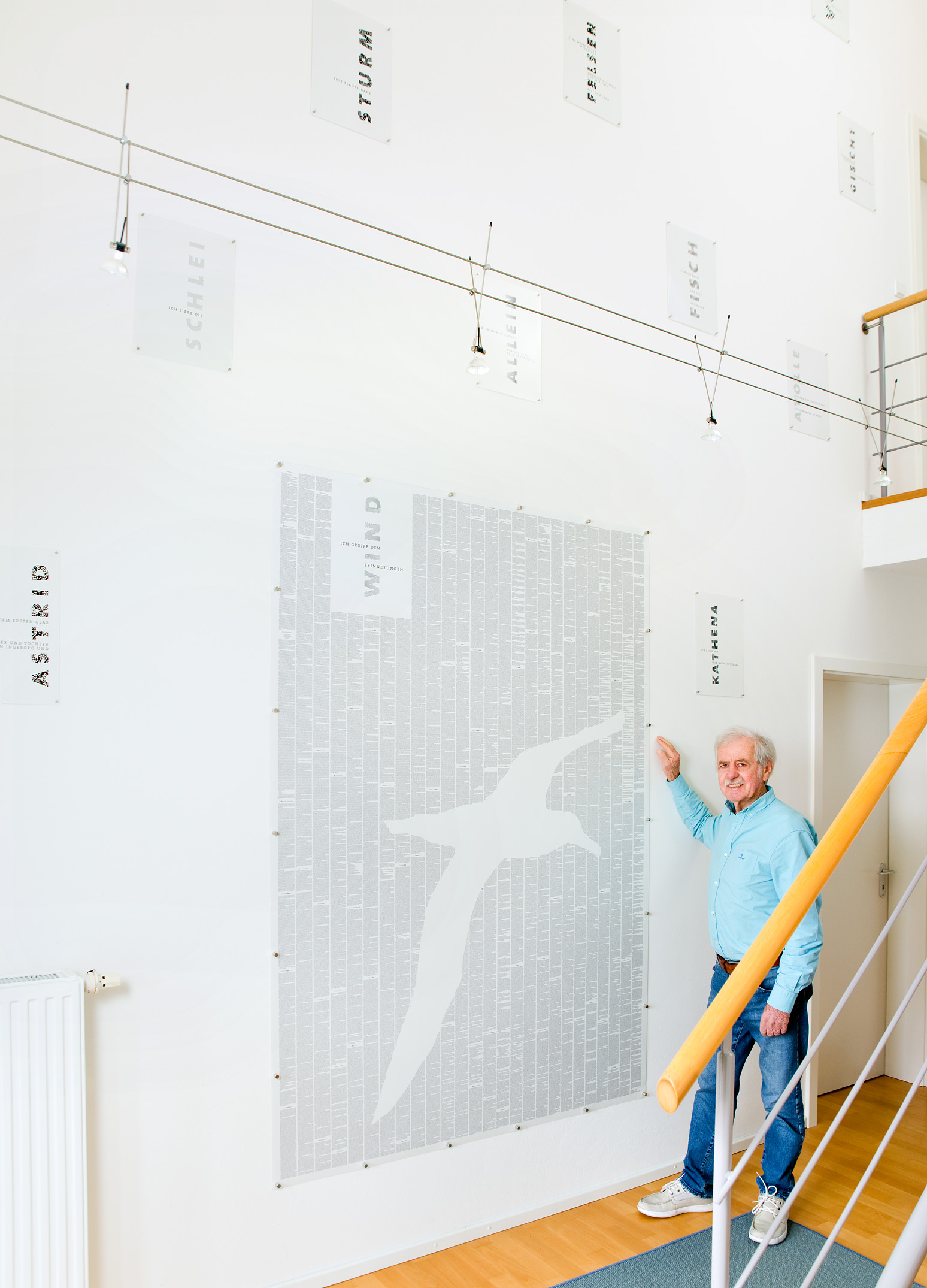 Ich stehe vor meinem Geschenk von Kym. Es ist ein nicht alltägliches Poster von 2,15 m Höhe und 1,45 m Breite und sieht prächtig aus. Einfach großartig. Der gesamte Text aus meinem Buch von »Ich greife den Wind«, also alle 640 Seiten, sogar lesbar, sind aufgedruckt. Genau diese Detailtreue schätze ich und liebe ich. Glücklicherweise haben wir den Platz in der Diele. Als es dann auf der Wand mit zahlreichen Magneten und zusätzlichen 12 Zitaten aus dem Buch fixiert ist bin ich ganz hin und weg über Idee und Machart.