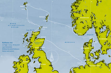Einmal in der Stunde trifft uns ein Brecher voll, und eine riesige Welle donnert übers Deck. Schafft es erfreulicherweise nicht ins Cockpit oder in die Plicht. Wind steht gegen Strom. Mitten auf dem Meer. Zeitweise gurgelnde Tide Rips, richtig chaotisch. Das echte Meer ruft nicht, es brüllt, es tost und tobt. In einer Welt, in der alles kontrollierbar scheint, ist das Meer unberechenbar. »Der Atlantik ist grässlich in diesem Dreieck Färöer, Orkney, Schottland.« A.s Worte treffen es. Sie leidet wie nie zuvor. In der zweiten Nacht will sie nicht mehr, und ich kann nicht mehr. Ich kann sie auch nicht trösten. Bin schlapp und desillusioniert. Und ganz schlimm: desinteressiert. Als wir einige Stunden auf dem Kajütboden kauern und uns ganz eng gegenseitig wärmen, vernachlässigen wir eigentlich alles: Ausguck, Segel, Schiff. Wir schlafen engumschlungen ein.
