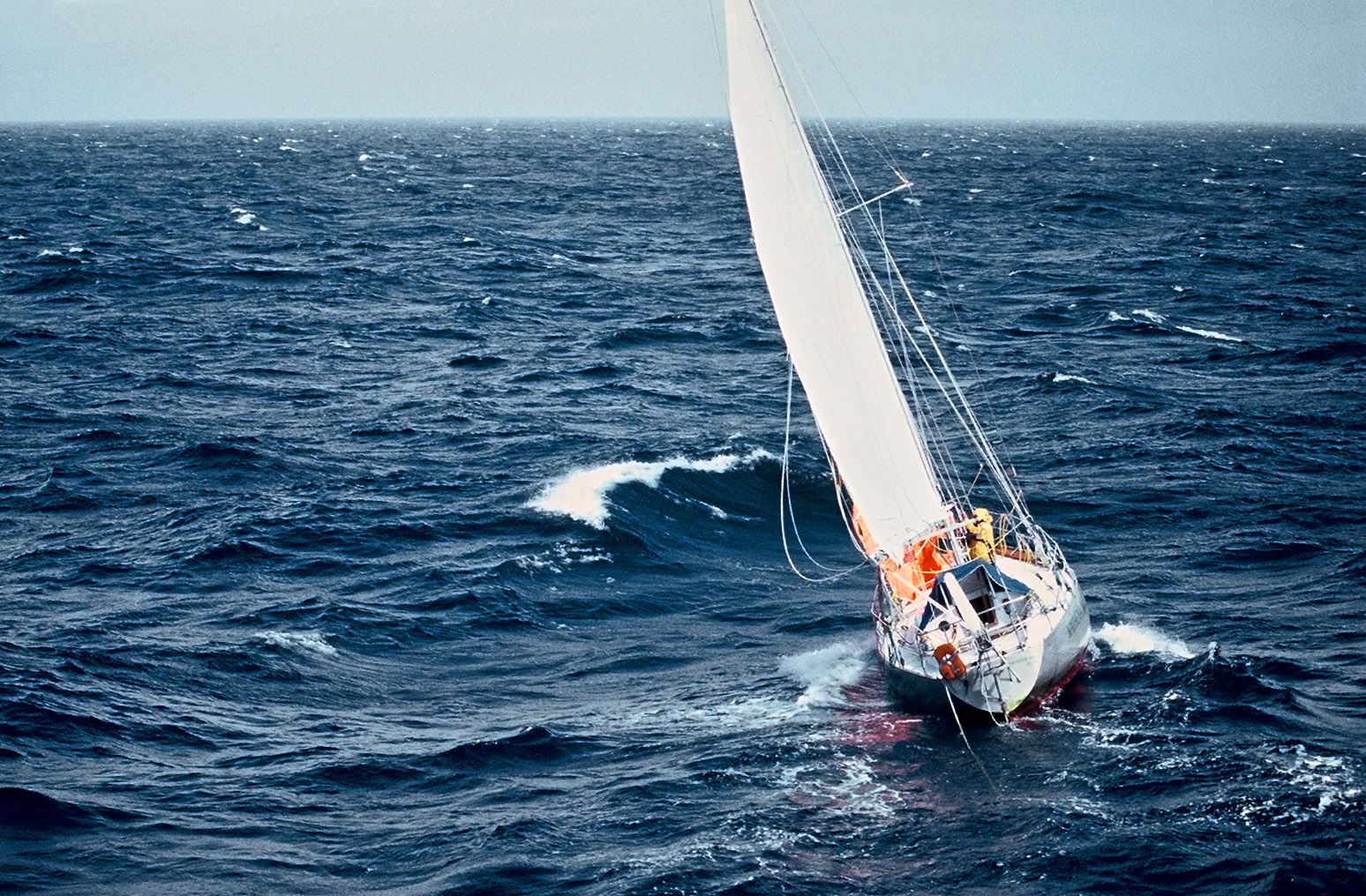 Der Pilot kurvte von allen Seiten über mein Boot. Währenddessen legte der Wind zu, ich musste sogar ein Reff ins Groß binden. Aber wichtiger, ich konnte direkt West halten. Nach 55 Minuten war das für mich ungewöhnlichste Ereignis vorbei. Der Flieger wackelte zum Abschied mit den Tragflächen und verschwand ruck zuck. Ich war wieder allein. Allein mit meinen Albatrossen. Noch aufgelöst dankte ich in Gedanken Kym, dass er alles so perfekt hingekriegt hatte, denn es war seine Idee, seine Zeit, seine Kosten. Vor allem beglückte Kym mich noch mit einer Zeitung, einem Kamm, ein paar Keksen und einem Brief, die er in einem Behälter abwarf. Großartig. Ich hoffte damals inständig, dass es mir vergönnt sei, ihm zu Hause dafür zu danken.