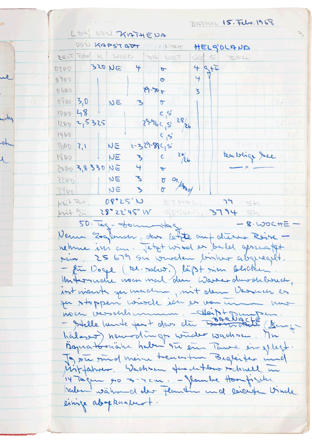 »Bei starker Dünung lebt und arbeitet es sich schlecht. Wieder mal etwas Sonnenschein. Bekomme Großsegel nicht in den Griff, erziele auch keine Selbststeuerung von Dauer, binde daher ein Reff rein.« »2 cm lange Platzwunde auf der Stirn, gegen Bücherbord gestoßen, blutet fürchterlich, mir ist ganz übel danach. An Schlaf ist nicht zu denken. Schädel brummt.« »Wasserproduktion steigt, 8 Pützen. Geht besser mit dem Kopf. Schöne Segelei, Passat ist beständiger geworden. Spritzer kommen in regelmäßigen Abständen über.«