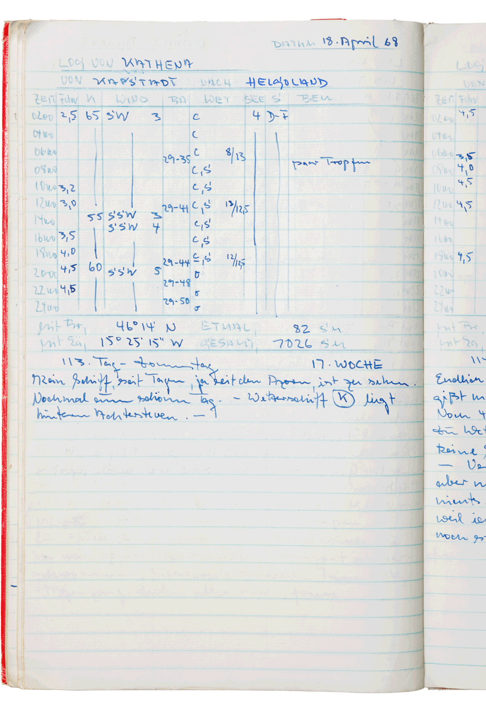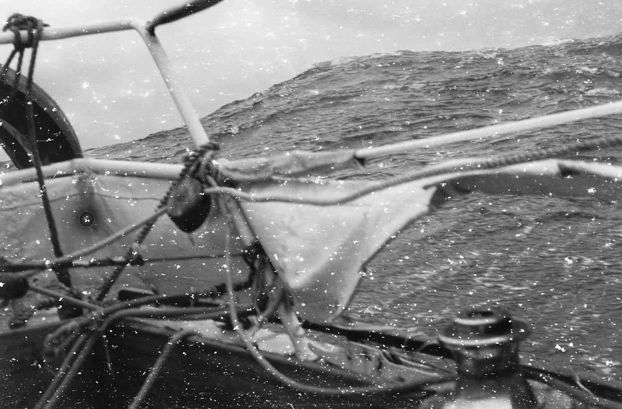 »Ich zähle jetzt jeden Tag, werde ungeduldig, wo ich mich doch bereits Ostern an Land gesehen habe. NW nimmt stetig zu, berge Fock zur rechten Zeit Minuten später Sturmbö mit Regen Regenbogen (geschlossen), Vollmond bei klarem Sternenhimmel. 9°C drinnen wie draußen, bekomme Sehnsucht nach den Tropen.« »Ein Wetter, mein Gott. Nachdem Fock II gerissen treibe ich. Mit Schlafen ist’s vorbei. Von Festfreude (Ostern) keine Spur, werde etwas schwermütig. Wann soll ich bloß ankommen, wenn es so weitergeht.« »Ostermontag, mein Geburtstag 28 Jahre, recht traurige Angelegenheit, nicht mal schönes Wetter. Sogar mit dem Kochen ist es man schlecht. Habe auch nicht mehr viel.« »Regen über Regen. Kurz vor Mittag steigt eine See ein. Reißt die Schutzbekleidung ab, Türen aus den Angeln (waren geschlossen), überflutet die ganze Kabine. Vermag K. nicht vorm Wind zu halten. Alle Trossen draußen. Ruder hart B-bord. 14 Uhr, Orkan hält unvermindert an. 18 Uhr weiter unvermindert, zittere vor Kälte und Nässe. Meine Lebensaufgabe: pumpen.«