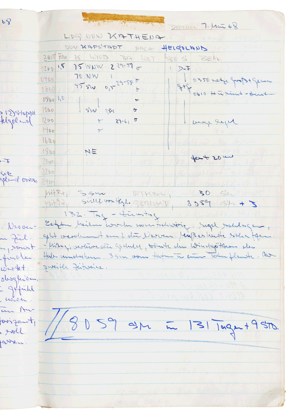 Die letzte Etappe meiner Weltumseglung vor genau 50 Jahren von Kapstadt nach Helgoland. Verfolgen Sie hier diese 131 Tage meiner aufregendsten Reise. Erlebbar machen möchte ich sie mit meinem Logbuch, das ich seither noch für niemanden geöffnet habe. Letzten Meilen werden noch schwierig. Segel schlagen, geht verdammt auf die Nerven. Muß es heute schaffen. Mittag: verliere die Geduld, könnte den Windgöttern den Hals umdrehen. 3 sm vorm Hafen in einer Totenflaute. Verzweifle zeitweise. fest 20 Uhr 8059 Seemeilen in 131 Tagen + 9 Stunden ![]() ![]() Eintragungen aus den letzten Tagen »Texel doch erwischt, hatte es nicht vorgehabt. Nachmittag, befinde mich in einem militärischen Übungsgebiet, holländischer Kreuzer liegt in unmittelbarer Nähe. Komische Jets, jedenfalls keine Starfighter.« »Dickste Suppe, Glück so weit vom Track entfernt zu sein. Jetzt da mittendrin hätte ich bestimmt keine ruhige Minute. Landvögel tauchen auf. Kollidiere mit 45 m langem, schwerem Kantholz mit 1 Knoten Fahrt. Mistwetter, kein einziges Schiff. Nochmal ordentlich kalt, 6° C in der Kajüte.« 131. Tag »30 sm noch, hurra, ja morgen sind wir da. Nervenaufreibend in dieser Flaute, so dicht vorm Ziel. Muß heute Nacht das Feuer von Helgoland erwischen, sonst könnte es schwierig werden, morgen die Insel zu finden. 23.02 Uhr, Helgoland Feuer genau dort, wo ich es erwartet habe. Spüre keine Müdigkeit, Kälte, Hunger oder dergleichen. Weggeblasen aller Ärger. Voller Erwartung. Ein Gefühl der Genugtuung, hänge meinen Gedanken nach. Morgen wird alles zu Ende gehen, 131 Tage im Angesicht der See, Tag um Tag der runde, leere Horizont, die absolute Herrschaft in meinem Reich, all das soll vorbei sein. Ich kann es noch nicht richtig fassen.«